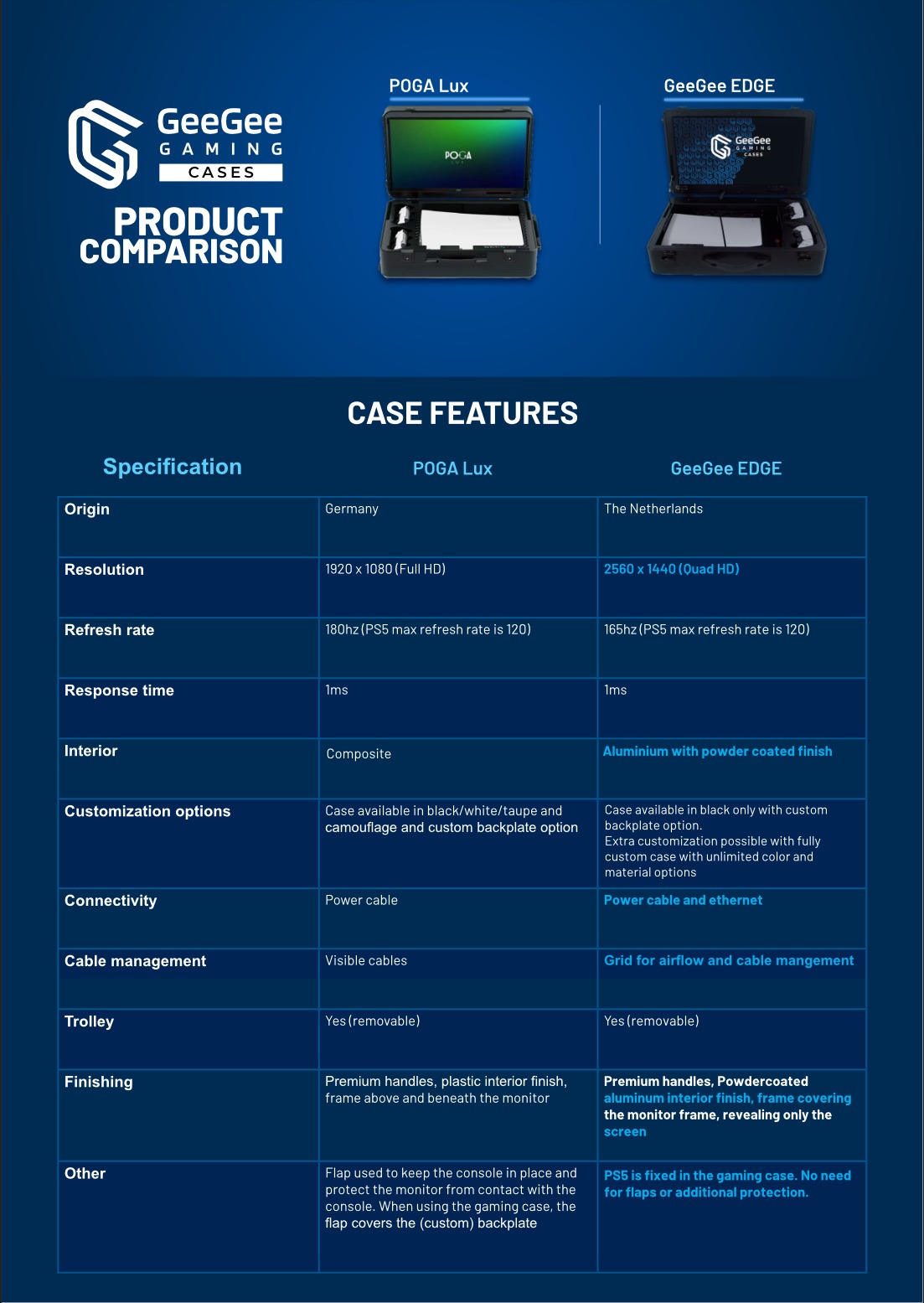 De GeeGee EDGE is compacter (24”) en ideaal voor persoonlijk gebruik of reizen. De GeeGee TITAN heeft een groter 27” scherm, robuuster ontwerp en is gemaakt voor events, verhuur en professioneel gebruik.